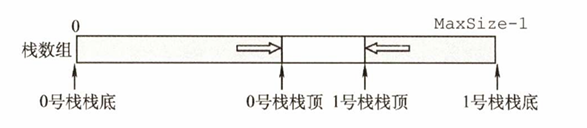让两个顺序栈共享一个一维数组空间,将两个栈的栈底分别设置在共享空间的两端,两个栈顶向共享空间的中间延伸。
