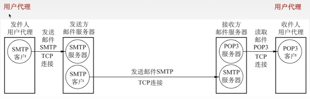 SMTP协议:规定了在两个相互通信的SMTP进程之间应如何交换信息。负责发送邮件的SMTP进程就是SMTP客户,负责接收邮件的进程就是SMTP服务器。(端口号25)